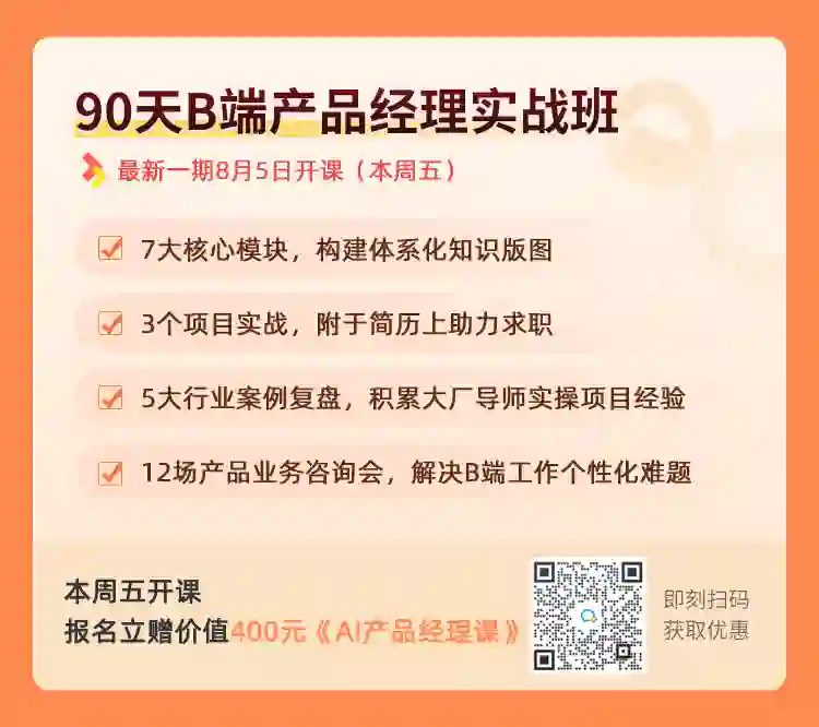 推荐你来《90天B端产品经理实战班》提升,多位10年+经验大厂实战导师在线直播,带你掌握系统的B端产品工作方法,助你顺利转岗&提升专业能力。