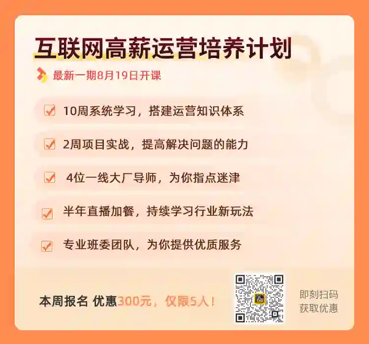 今天给大家推荐《互联网高薪运营培养计划》,用10周时间,从0-1,补齐各个模块的能力,搭建起运营系统知识体系,为升职加薪做好充足准备!