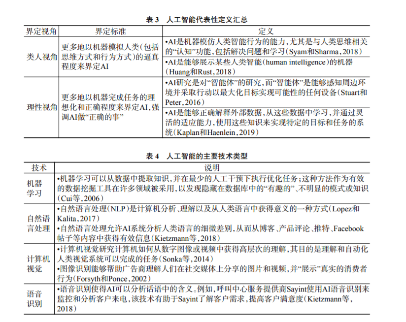 根据世界知识产权组织(WIPO)发布的《2019年人工智能技术趋势报告》,在和人工智能 (AI)相关的将近34万项发明和超过160万种科学出版物中,一半以上的专利是2013年以后公 开发表的。有关AI的科学研究正处于集中快速推进的时期。与此同时,AI在商业领域的应用也 日益深化。根据德勤2018年发布的《中国人工智能产业白皮书》,近五年来全球AI领域投资快 速增长,全球AI融资总额2017年达到104亿美元,并在2018年持续增加。艾媒咨询2020年的研 究报告显示,2019年中国AI产业融资总额达898亿元人民币。从营销中AI的应用实例来看,在 智能客服方面,Facebook打造的虚拟助手“M”能够帮助用户购物、预订酒店、安排行程等;阿里 巴巴未来酒店实现了由AI智能机器人提供送餐等服务。在消费者洞察方面,Netflix利用AI应用 “Layer 6 AI”,能够更精确地预测用户的兴趣,进行个性化推荐;字节跳动在2016年建立了人工 智能实验室(AI Lab),为平台输出海量内容提供AI技术支持,并应用到抖音等产品中。在广告投放方面,Google的广告工具“Auto Ads”通过机器学习帮助营销人员确定广告的最佳摆放位 置。综上,AI在营销领域各个环节逐步实现了应用的落地,也给该领域的学术研究提供了更多 的可能性。