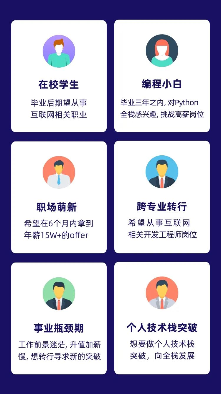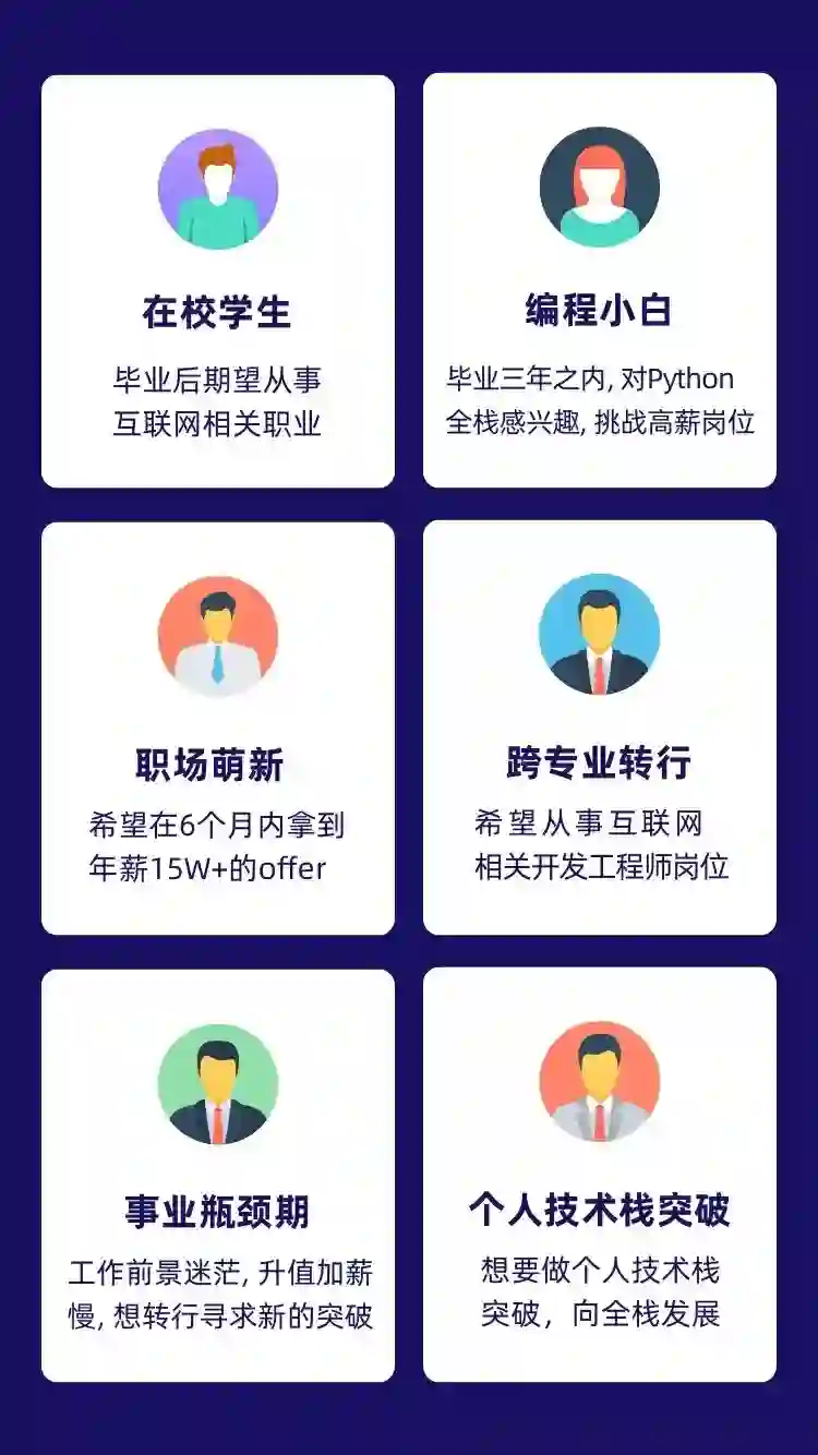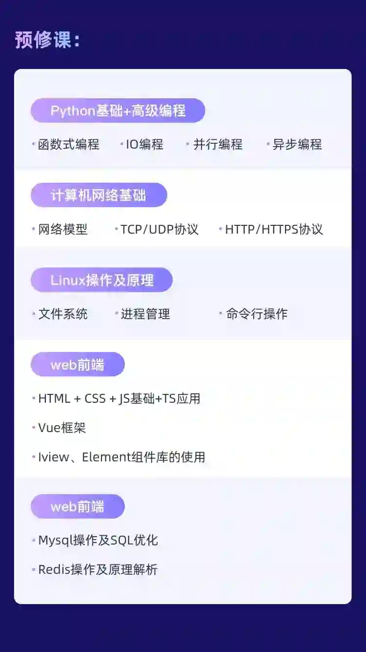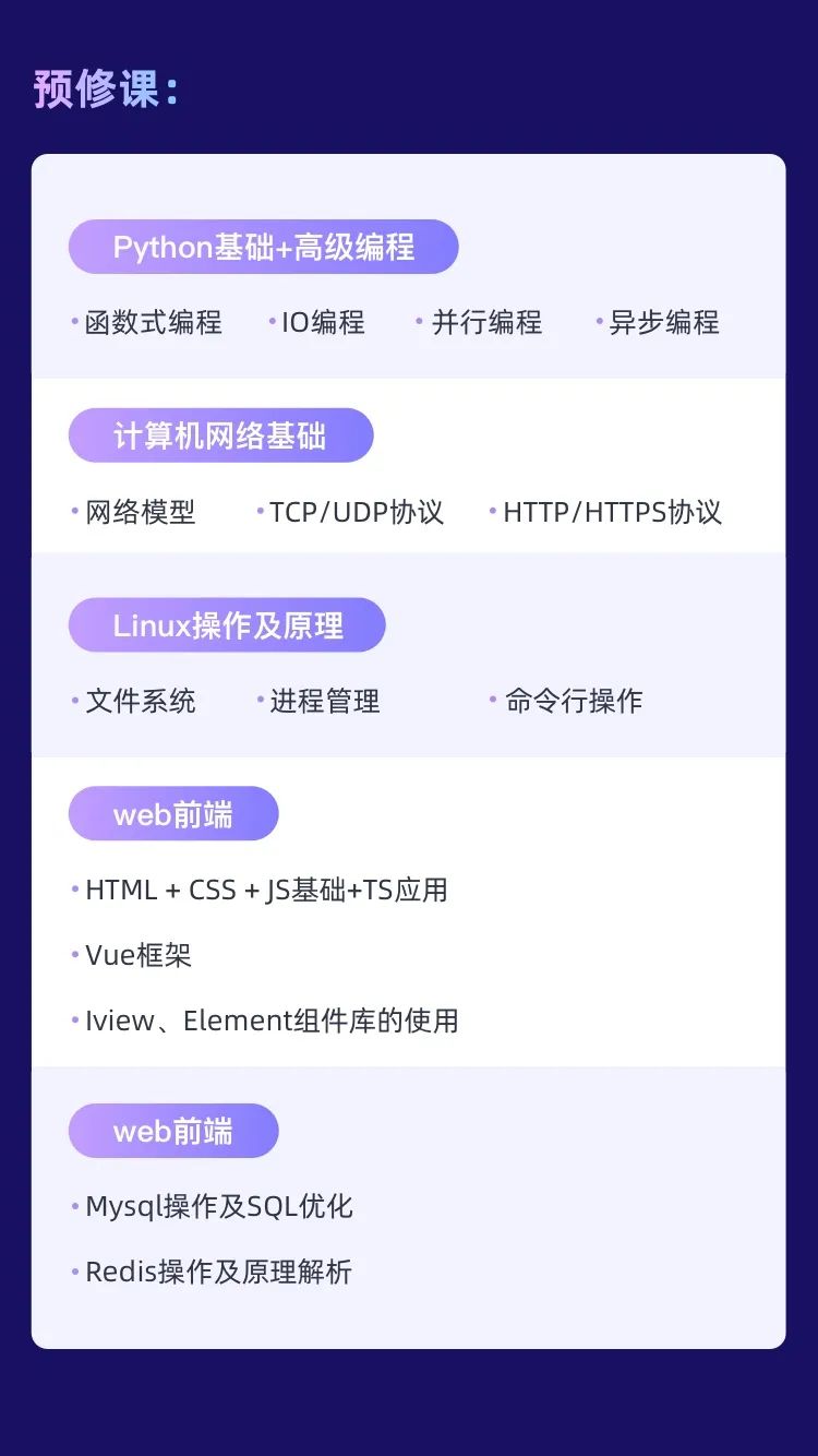 课程包含预修课和真实企业项目两大课程,帮助各位学员掌握必备知识技能,快速成长为Python全栈开发工程师,实现高薪职业!