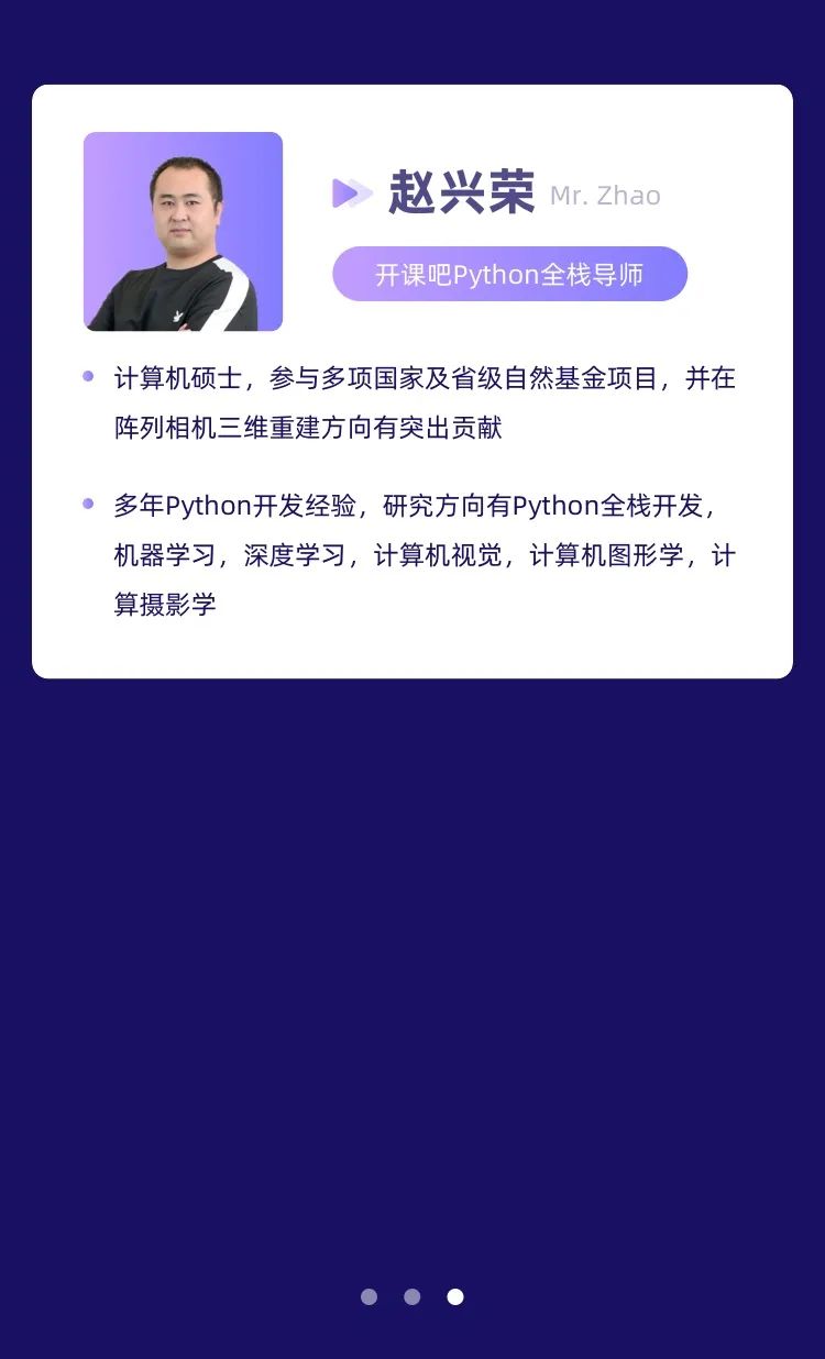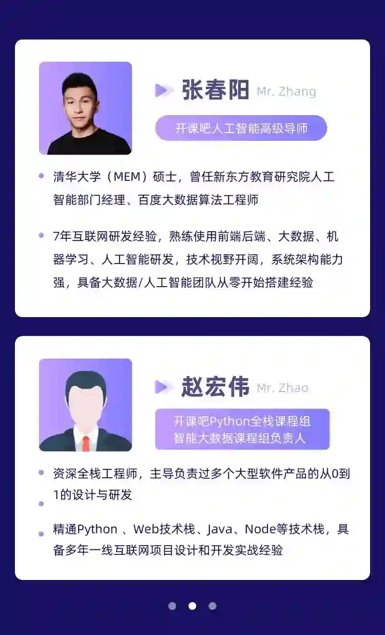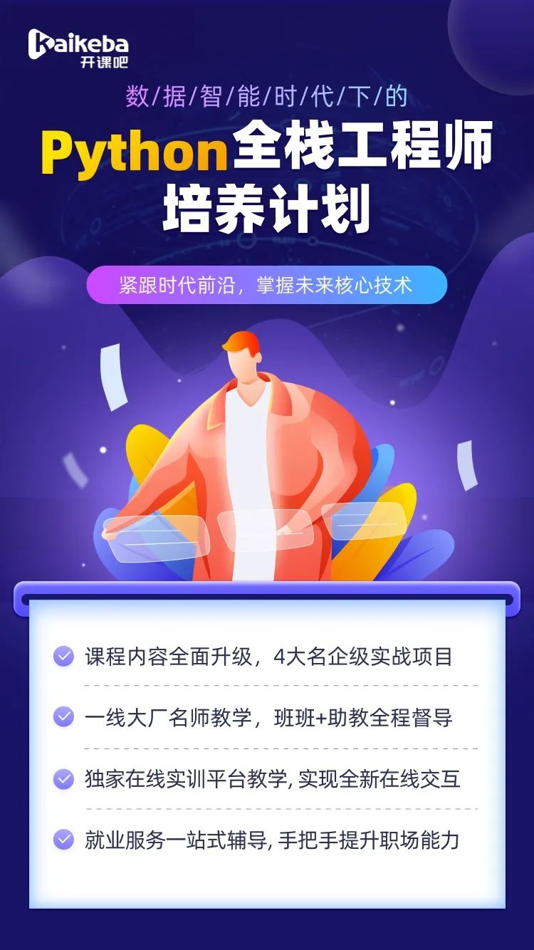同时,开课吧人工智能事业部在职场需求和趋势分析的基础上,研发出《数据智能时代下的Python全栈工程师培养计划》课程。本课程采用一站式企业级项目驱动,以行业内最火爆的高度聚集的文化社区和视频平台企业级项目为实战课程,帮助各位学员快速成长为Python全栈开发工程师,实现高薪职业。