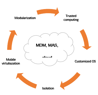 政务手机的操作系统具有较高的机密性和完整性要求,其发展是从早期的功能机(非智能操作系统)到专用的操作系统(基于Win CE)再到现在引入商用的操作系统,如黑莓、Android和iOS。但是这些商用操作系统都要经过相关部门严格的审核,并根据不同的应用场景,对设备和系统功能进行修改和裁剪。