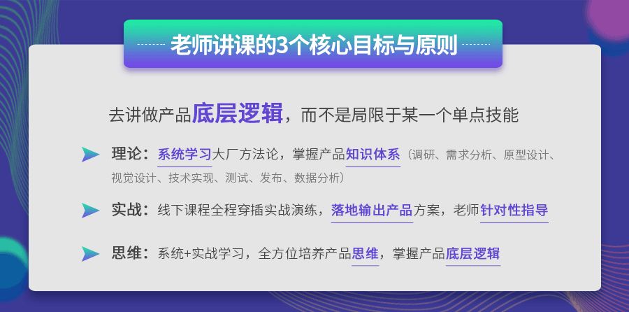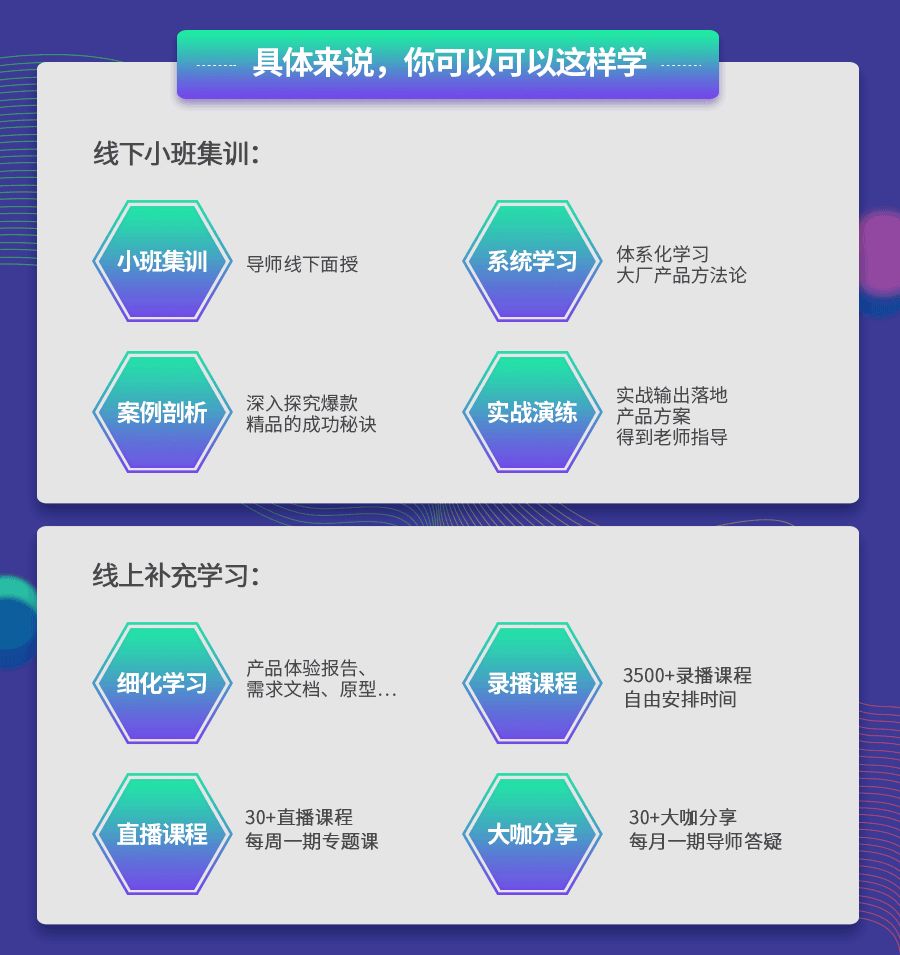 因为线下的课程,就是跟着腾讯、百度的产品大牛,通过系统+实战学习如何从0到1做一款产品,基于需求去分析、规划、设计……