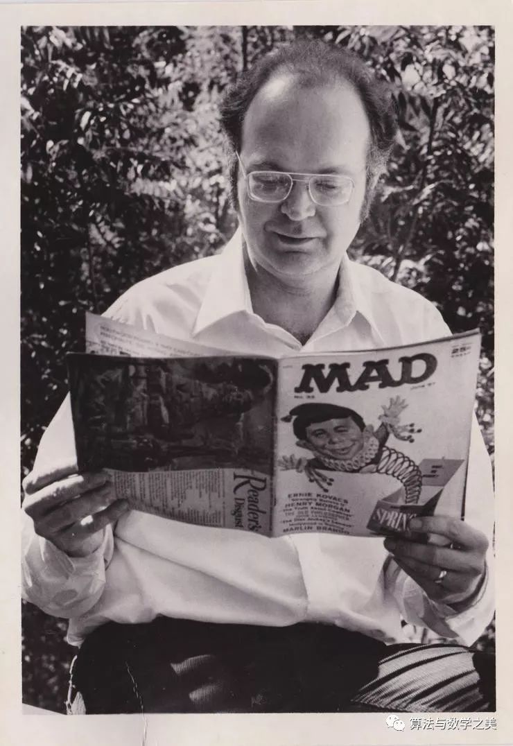 摄于 1981 年,Knuth 正在看 1957 年出版的《疯狂》杂志,这本杂志里有他发表的第一篇技术论文,发表这篇论文的时候他才 19 岁。