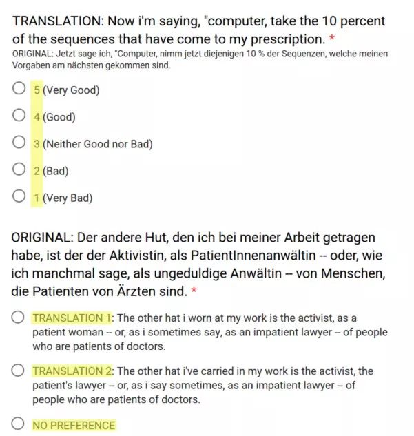 不同于普遍接受的看法,在 Kreutzer 等人 2018 年的工作中,他们发现 5 分制评分的评分者信度(Krippendorff’s α=0.51)要高于成对判断(α=0.39)。他们通过对每个评分者的基本判断进行标准化,消除个人偏见的可能性,从而解释这一点,并且过滤掉了评分者信度较低的评分者。成对判断主要的问题是差不多好或者差不多差的翻译结果之间的区别(较小),我们可以将这样的翻译结果过滤掉,从而提高评分者信度,最终得到上文所述的评分者信度。
