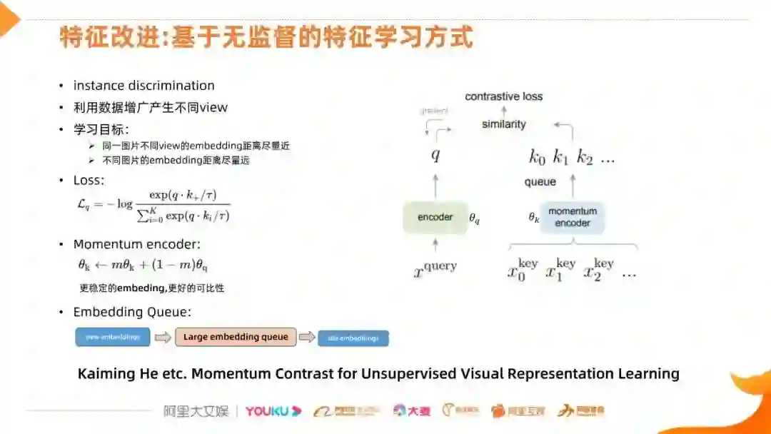 目前无监督的特征学习方式主要参考Kaiming He团队的论文,现在主要流行instance的分类框架,首先利用数据增广产生不同的view,学习目标是同一图片不同view的embedding距离尽量近,不同图片的embedding距离尽量远。