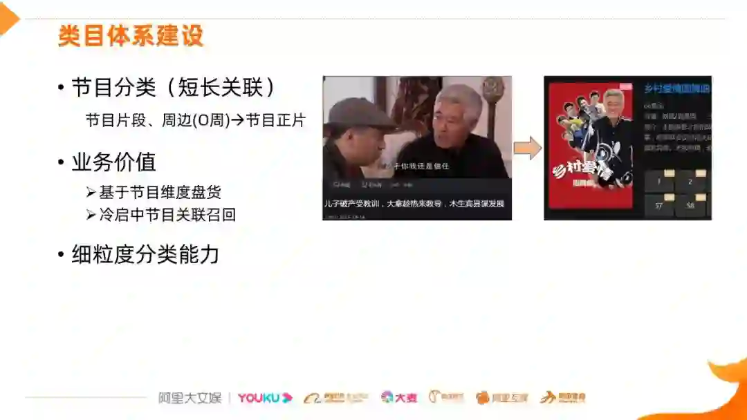 节目分类也叫短长关联,也就是识别一个节目的片段和周边,来源于哪个节目,并与正片挂靠,这是一个分类的问题。在这里单独把节目分类分出来,主要是因为这样可以有更加细化和明确的价值。