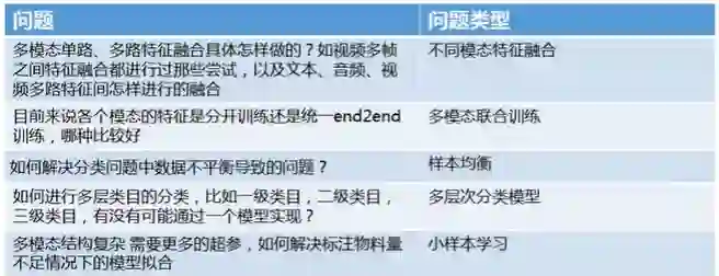 第二类,把各模态的特征模型和分类模型分开训练还是统一训练。从工程的角度看,统一训练的方式是很难实施的,试想一下对上千万的视频片段做分类,它的视频帧就上亿,直接在图像帧上训练整个网络,训练成本是非常高的,再加上音频、文本,训练成本就更高。基于此,我们将各模态的embedding和embedding后的融合分开来做,简化了问题。