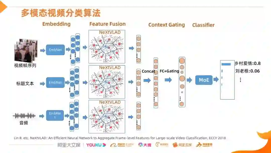我们采用的多模态视频分类网络结构,可分为4个阶段,首先是视频信息的多模态Embedding,形成多帧的特征,然后经过一个基于聚类和残差的NeXtVLAD融合网络,这个网络目前比较常用和性能不错,融合出来就是一个单帧的feature,然后将多模态信息进行连接,通过FC做映射,另外还有一个Gating的过程,Gating过程的作用就是发掘各个维度之间关联的信息,然后有选择性地增强一些维度,抑制一些无关的维度,调整之后的信息会送到一个分类网络,这里比较常用就是MoE ( 多专家的系统 ),最终会得到一个预测结果。