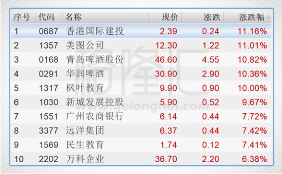 今日港股通标的中涨幅前五的个股是香港国际建投(00687.HK)、美图公司(01357.HK)、青岛啤酒股份(00168.HK)、华润啤酒(00291.HK)、枫叶教育(01317.HK)。