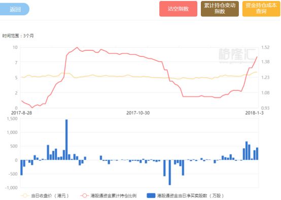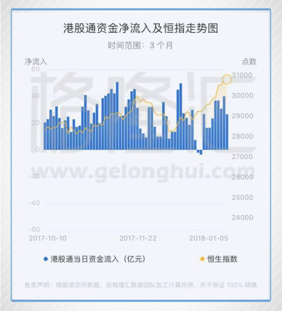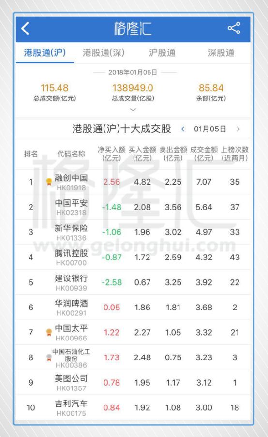 今日港股通自己共计净流入26.6亿元。龙虎榜数据显示,今日港股通(沪)前十大成交个股是融创中国、中国平安、新华保险、腾讯控股、建设银行、华润啤酒、中国太平、中国石油化工股份、美图公司、吉利汽车。其中净流入最多的个股是融创中国,净流入2.56亿港元;净流出最多的个股是建设银行,净流出2.58亿港元。