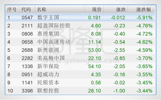 今日港股通标的中跌幅前五的个股是数字王国(00547.HK)、超盈国际控股(02111.HK)、惠理集团(00806.HK)、中国高速传动(00658.HK)、新奥能源(02688.HK)。