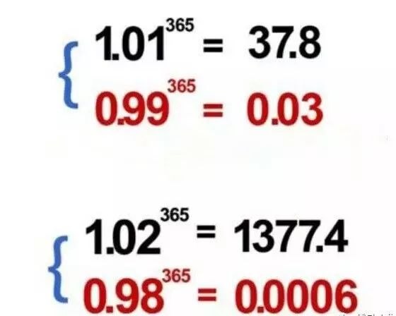 一个很励志的说法:只要每天在前一天的基础上进步1%,365天后,自己的能力水平就是一年前的37.8倍,如果进步2%呢?就增加到377.4倍;与之相反的是,如果每天在前一天的基础上退步1%,365天,自己的能力水平就是一年前的0.03倍,如果退步2%呢?就减至0.0006倍。