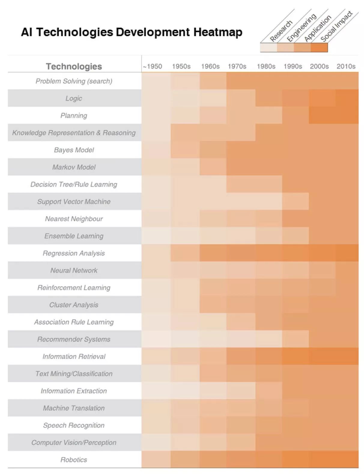 3)分析人工智能(AI)下各分支技术在产业中的实际应用情况,评估其在「研究」、「工程」、「应用」、「社会影响」这四个阶段中所处位置,为计划使用人工智能技术的决策者提供决策参考。