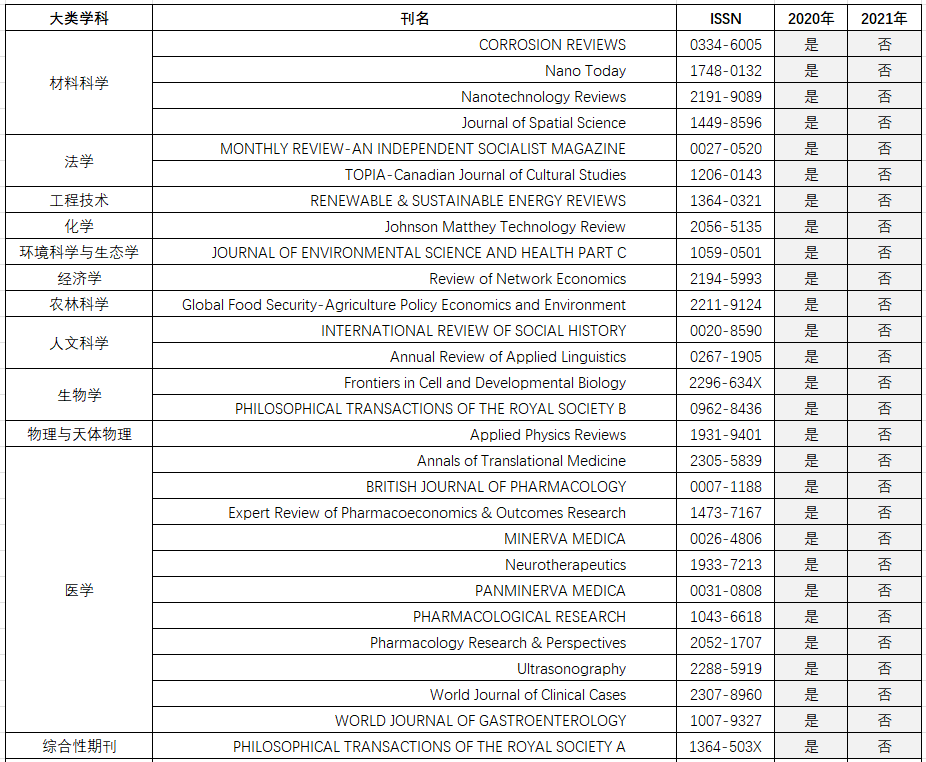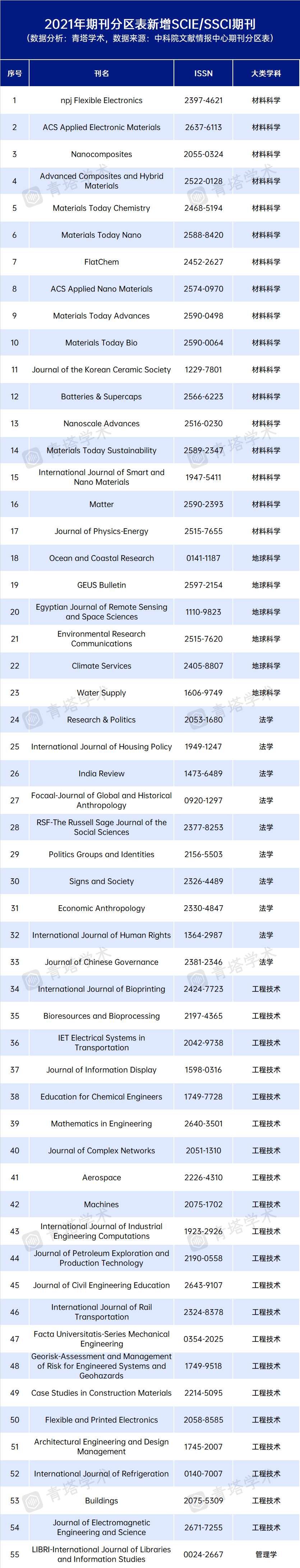 2021年期刊分区表,根据期刊定位和论文的引用关系,将新增的217本SCIE/SSCI期刊和113本ESCI中国期刊,划入到对应的大类学科。