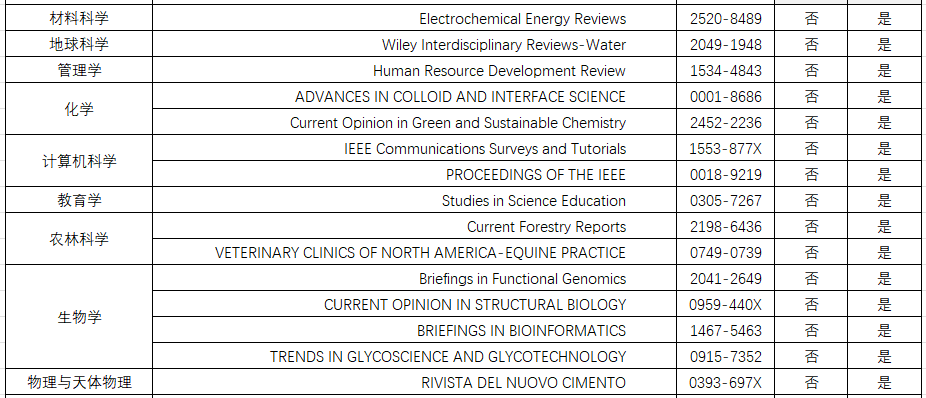 数学、物理与天体物理、化学、材料科学、地球科学、环境科学与生态学、农林科学、生物学、医学、心理学、计算机科学、工程技术、管理学、经济学、法学、教育学、人文科学和综合性期刊。