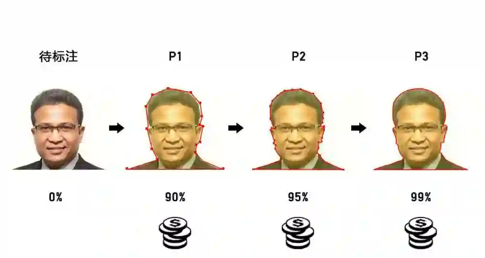 比如常规准确率为为95%的系统,在常规情况下,只有通过增加更多轮次的检测来提升精度,这就意味着消耗更多的成本。一些特殊项目,人力需求可能会因为超高精度的需求而翻几倍。平台通过动态准确度计算以及多用户渐进式标注等方法来解决这一问题。