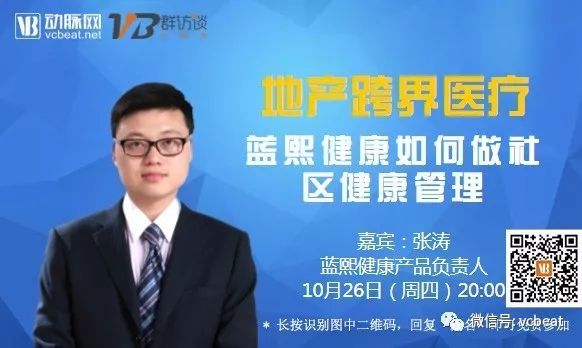 本周四(10月26日)晚8:00,蓝熙健康产品负责人张涛将做客动脉网的VB群访谈,和大家分享“蓝熙健康如何做社区健康管理”。届时将为你揭开地产跨界医疗火热现象背后的真相;如有疑问,也可在访谈中提问。期待与你共同聆听产业的声音!
