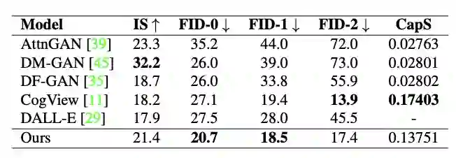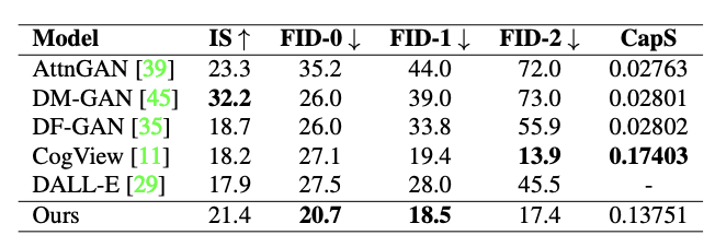 CLIP-GEN拿到了最高的FID-0、FID-1分数;CapS得分(衡量输入文本和生成图像之间的语义相似性)除了比CogView低4%,比其他模型都高很多。
