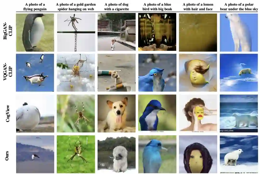 在下面这组非常规的文字描述中,比如生成“一只会飞的企鹅”,“叼雪茄的狗”、“有脸和头发的柠檬”……CLIP-GEN基本都可以实现,别的模型却不太能理解。