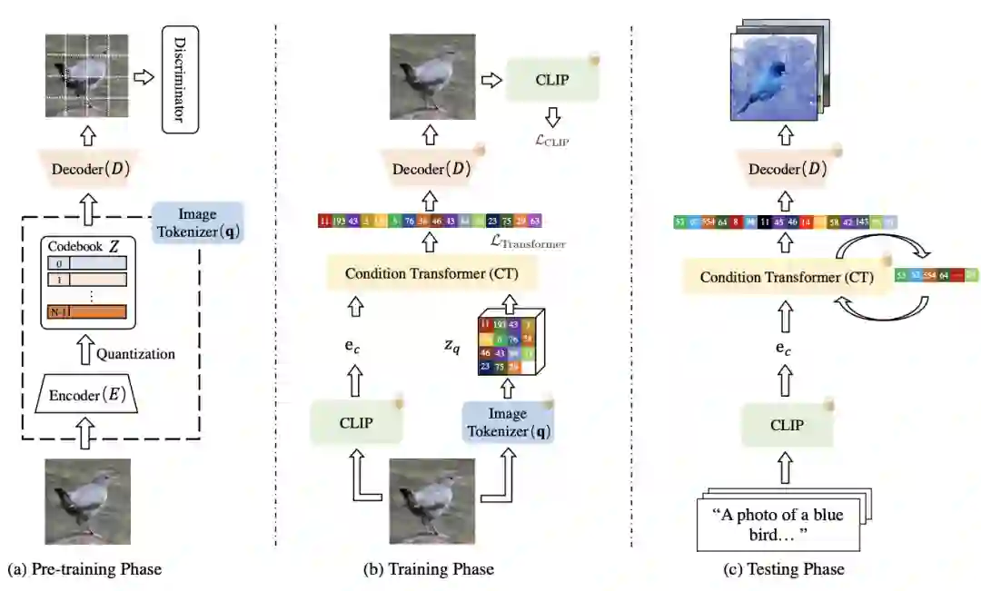 经过这样的训练后,面对一串文本描述,Transformer就可以根据从CLIP的文本编码器中提取的文本嵌入(text embedding)生成对应的图像标记(image tokens)了。