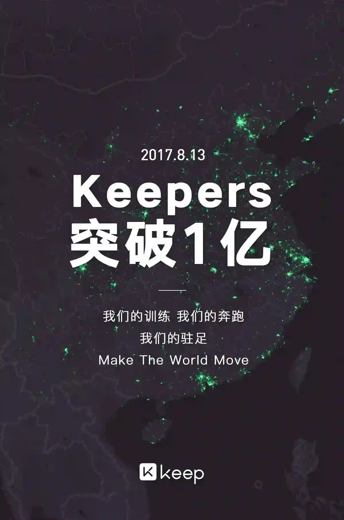 Keep 于2015年2月4日上线app store,由于快速的用户增长及融资进展而受到行业关注。其中,100万用时3个月,1000万用户用时9个月,1亿用户用时2年7个月,总共用时921天,团队成立的两年半时间内公司共完成了含天使轮在内的5轮融资。