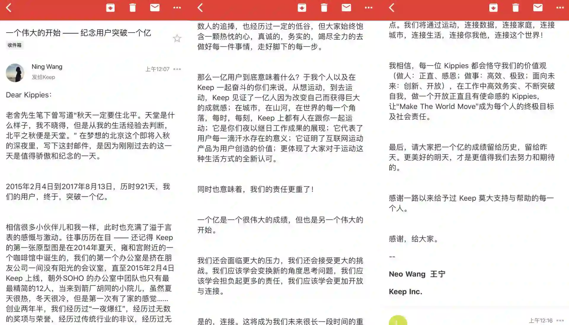 当晚,Keep 创始人兼CEO王宁发布内部信,回顾Keep创业历程,并表示Keep未来的战略发展关键词为“连接”。“连接,将成为Keep未来很长一段时间的重点,将通过运动,连接数据、连接家庭、连接城市,连接生活,连接你我他,连接这个世界!”