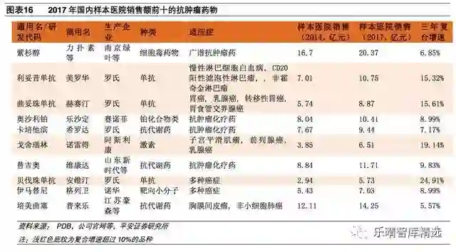 前十药物中化疗药物占比还很高,未来这部分份额有相当一部分将会被靶向药物替代。