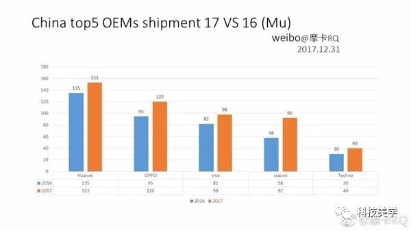 辞旧迎新的时刻,业内人士摩卡RQ在微博上分享了他制作了国内TOP5 OEM手机厂商的近两年出货量对比,单位时百万台。