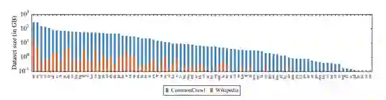 每种语言的常见爬虫数据集的容量增加超过了维基百科的(来自XLM-RoBERTa论文)