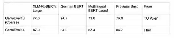 在本文中,我们重点介绍XLM-R模型的关键要素,并探讨其在德语中的性能。我们发现,在三个流行的德语数据集上,它的表现优于我们的单语德语;虽然在 GermEval18 (仇恨语音检测) 上与 SOTA 性能相当,但在 GermEval14 (NER) 上显著优于以前的方法。