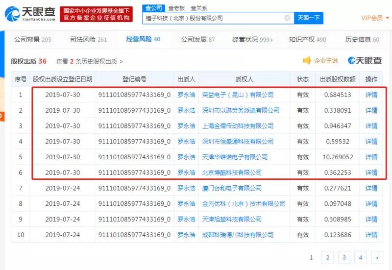 7月30日,锤子科技(北京)股份有限公司再度新增6条股权出质信息,出质人为罗永浩,他将自己的股权分别出质给荣益电子(昆山)有限公司、深圳市以琳劳务派遣有限公司、上海金儒传动科技有限公司、深圳市恒盛通科技有限公司、天津华维诺电子有限公司和北京博酷科技有限公司。这已经是今年以来锤子科技第35条股权出质信息。(天眼查)