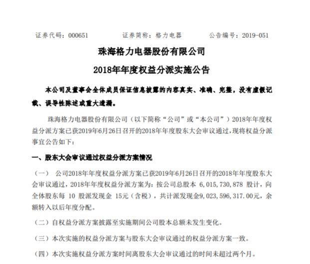 【格力电器将实施年度分红,共计派发现金超90亿元】7月31日,格力电器发布最新分红公告称,公司即将实施2018年年度权益分派,按照公司总股本向股东每10股派现15元(含税),共计派发现金90.2亿元。2018年度权益分派股权登记日为8 月5日,除权除息日为8月6日。