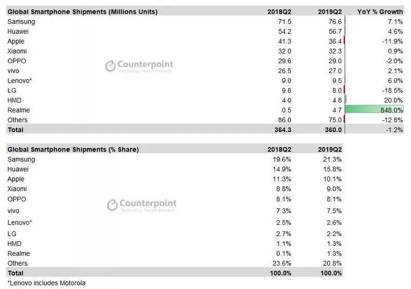 Counterpoint数据显示,2019年第二季度全球智能手机出货量为3.6亿台,同比下降1.2%,其中三星(7660万台)、华为(5670万台)、苹果(3640万台)、小米(3230万台)、OPPO(2970万台)、vivo(2700万台)排名出货量前六,此外,realme以470万台的出货量跻身全球出货量前十。