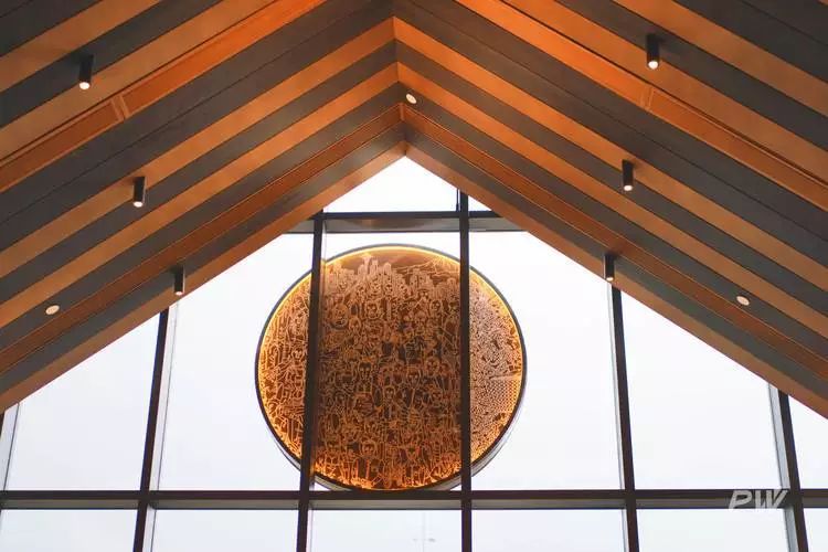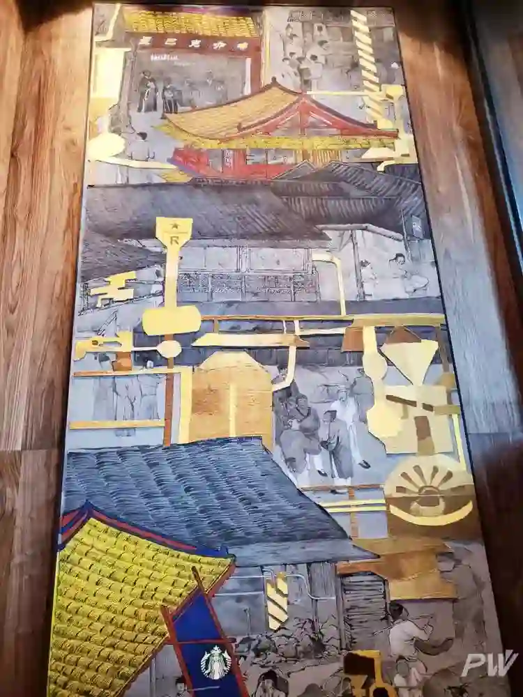 从一楼上到二楼还有一个很重要的小彩蛋——在楼梯拐角处的墙上有一张巨幅的清明上河图风格的壁画,左下角还有个星巴克的小 logo。