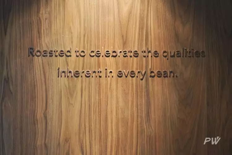 除了这些与咖啡和茶相关的容器外,这家星巴克旗舰店的墙上随处可见英文的 Slogan。