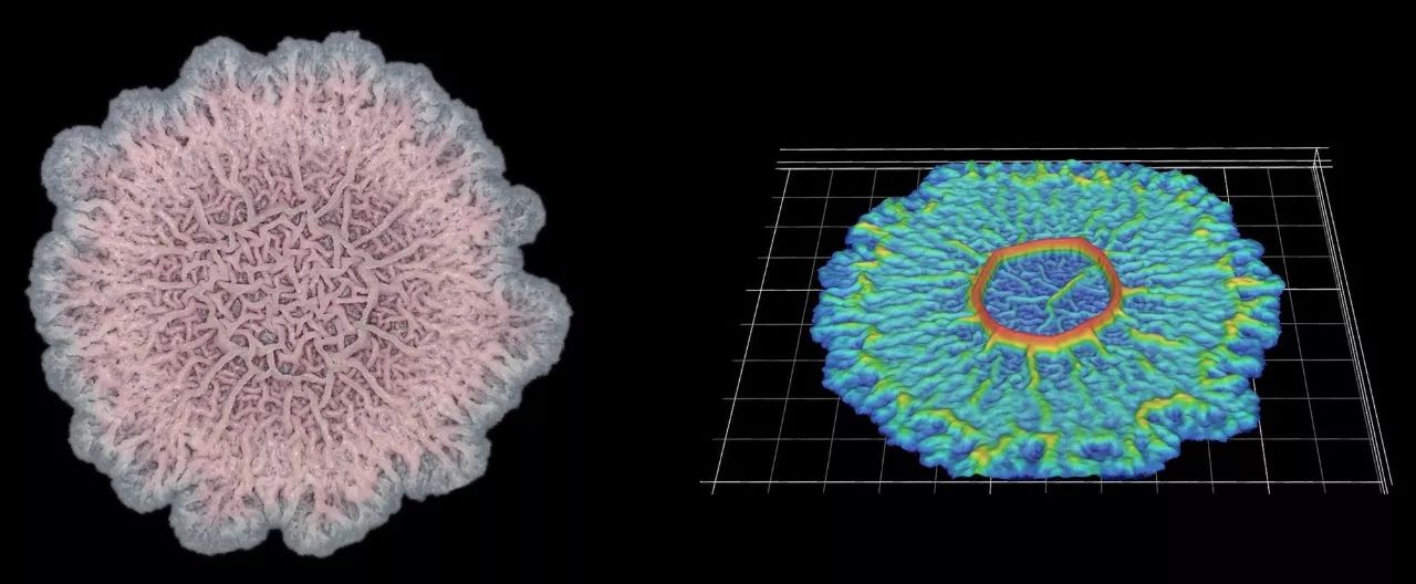 这种枯草芽孢杆菌生物膜的褶皱结构有助于确保其中的所有细菌的氧气供给(左)。 生物膜的三维数字扫描模型有助于说明细菌群落如何改变其结构(右)。