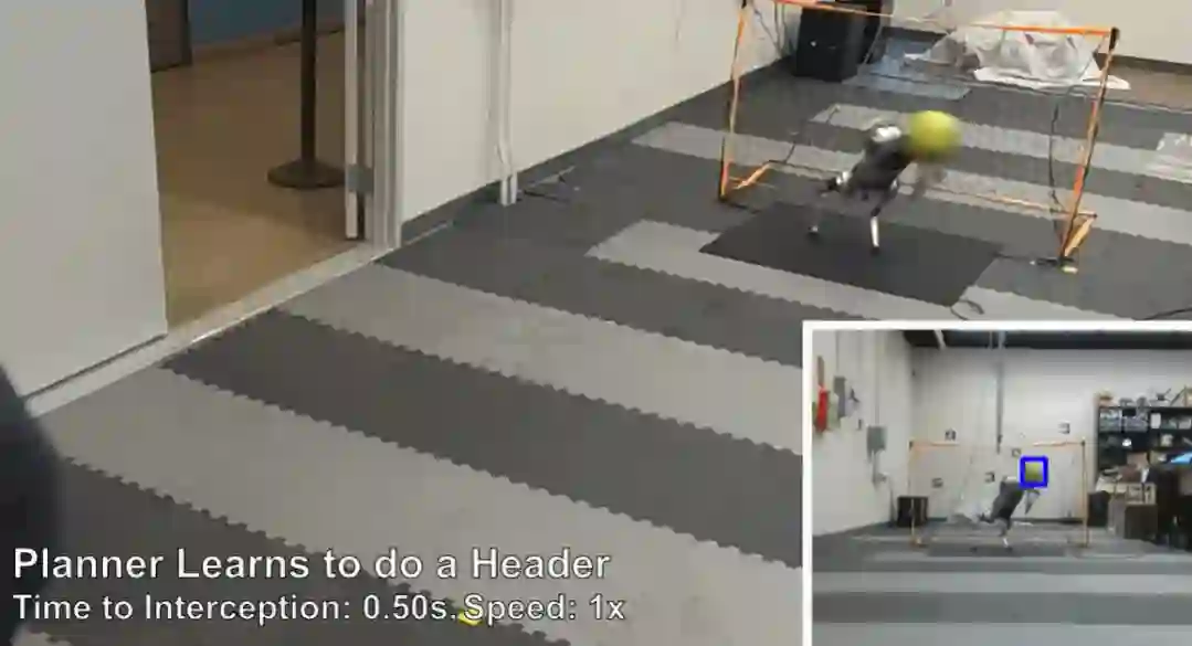 让 Mini Cheetah 学会守门还是一件比较难的事,因为这涉及物体(例如球)抛出的高度以及动态移动的位置,具体而言,一方操纵一个快速移动的球,球的方向和位置不确定,而另一方需要迅速判断球的位置以阻止进球。想要完成这一任务,需要教会机器人动态移动它的身体,同时确保它的脚 (或脸) 到达它们需要及时阻挡球的地方,这基本上是将两个难题结合在一起。