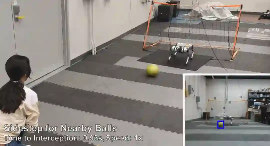 该研究在 MIT 2019 年提出的 Mini Cheetah 四足机器人上部署了上述 RL 框架,实验表明这种 RL 框架能够让四足机器人有效拦截现实世界中快速移动的球。