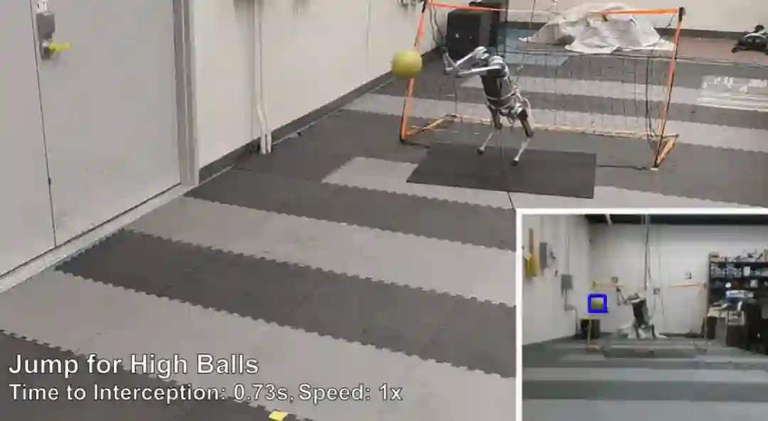 这些控制策略让机器人能够跟踪随机参数化末端执行器的轨迹,同时执行特定的运动技能,例如跳跃拦球、扑球和顺势拦住地面滚动的球。