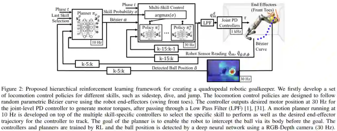 为了完成这个挑战,研究团队提出了一个分层无模型强化学习 (RL) 框架。该框架包含一个针对不同运动技能的多个控制策略,覆盖了目标的不同区域。