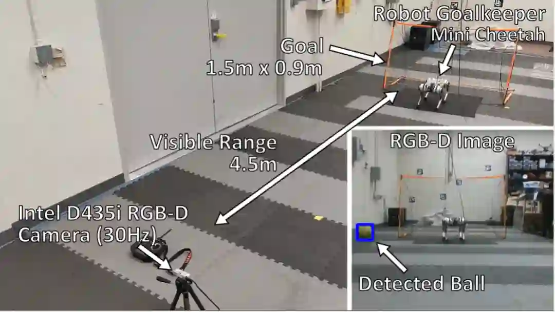 首先,让四足机器人做足球守门员是一个很有挑战性的问题,因为它必须要同时解决预测物体运动轨迹和机器人捕获非抓握物体(球体)两个实际问题。机器人需要在很短的时间内(通常不到一秒)对空中飞行的球做出反应并拦截。
