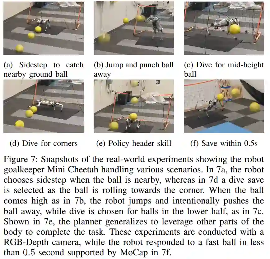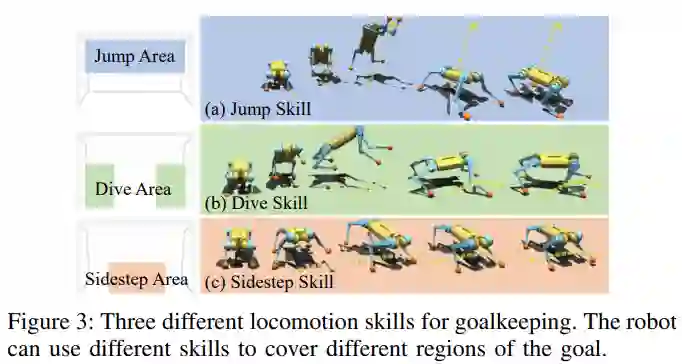 完成上述过程,还需要训练 Mini Cheetah 掌握一套有用的守门员技能,例如 Mini Cheetah 需要掌握在地面附近和靠近地面的地方对球进行侧身拦截、掌握俯冲到达球门的下角技术、跳跃到球门的顶部和上角。做完这些动作,Mini Cheetah 都可以恢复并最终安全着陆。每个技能的参考动作都是手动编程的,在模拟中进行训练,然后直接迁移到机器人上。
