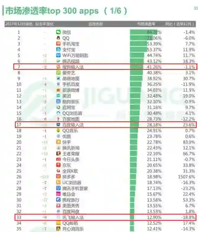 其实,不要说月活用户破6亿,目前中国互联网领域MAU超4亿的应用也只有八个,分别为:微信、QQ、爱奇艺、腾讯视频、支付宝、淘宝、优酷、微博。搜狗输入法或许是第九大MAU超4亿应用的有力竞争者,讯飞则还有很长一段路要走。