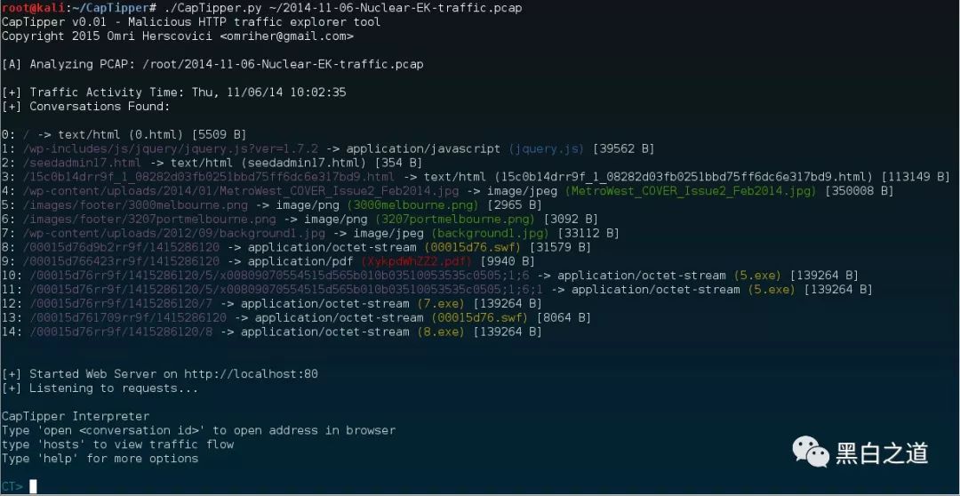 CapTipper设置一个Web服务器,其作用与PCAP文件中的服务器完全相同,并包含内部工具和强大的交互式控制台,用于分析和检查找到的主机,并且对话。