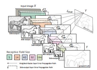 VGG-16作为backbone。在VGG-16的5个block的Max Pooling降采样之前,HED通过side_branch函数产生了5个分支,最后这5个side_branch的输出通过Concatenate操作合并在一起。网络的5个side_branch和一个fuse branch通过sigmoid激活函数后共同作为网络的输出,每个输出的尺寸均和输入图像相同。