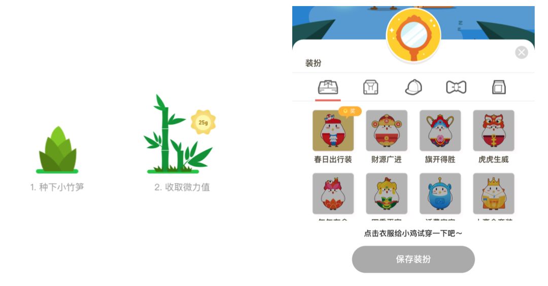 蚂蚁森林:用户通过线上(网络购票)或线下(行走、单车)的绿色行为获取绿色能量,也可以收取好友的能量,或赠送给他们能量。能量达到一定量后,可以选择树种、并种植真树。