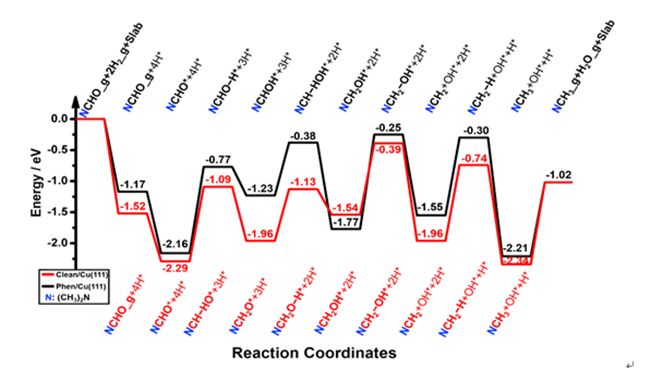 进一步的DFT计算结果表明,相比于裸露的Cu(111)面,DMF在1,10-邻菲罗啉修饰后的Cu(111)面转化为三甲胺的各个中间态能垒显著增加,从而有效地降低了DMF进一步加氢为三甲胺的可能性。