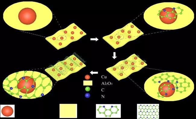 研究人员使用XRD、TEM等手段揭示了CuAlOx表面氮掺杂碳膜形成的条件与过程,发现以1,10-菲啰啉为前驱体,氢气气氛下可以实现碳膜的可控构筑。以XRD表征不同制备时间的催化材料发现,随着反应时间的延长,层状碳配体的衍射峰越来越强。而TEM表征则说明,层状碳配体首先在催化材料的边缘开始生成然后逐渐覆盖催化材料的表面。