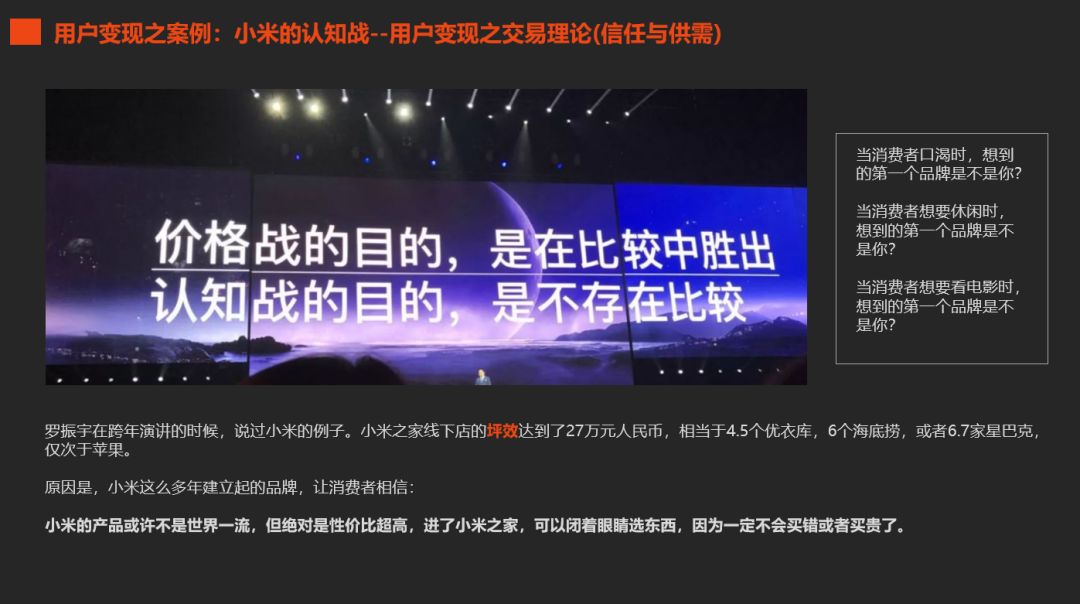 罗振宇在跨年演讲的时候,举过小米的例子。小米之家线下门店的坪效达到27万人民币,相当于45个优衣库、6个海底捞、6家星巴克,仅次于苹果。这个成绩很不错,但是小米是怎么做到的呢?归功于小米这么多年来建立的品牌,它让用户深信不疑:小米的产品可能不是世界一流的产品,但是性价比很高。因此小米和苹果、和华为都没有可比性,因为在性价比这一项,它就赢了。这就是罗振宇总结的“价格战的目的,是在比较中胜出;认知战的目的,是不存在比较”。